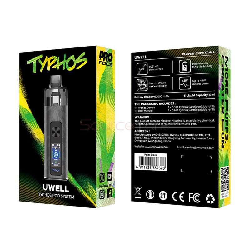 The UWELL TYPHOS KIT delivers high performance in a stylish, compact form. Powered by a 2000mAh battery and supporting up to 45W output, the UWELL TYPHOS is optimized for both RDL and MTL vaping. It features a spacious 6ml top-fill pod, dual output modes (Wave/Storm), and a vibrant 1.05″ HD screen for real-time control. With CoreShield leak-proof tech, precision airflow adjustment, and long coil lifespan, this kit is perfect for vapers seeking a versatile and leak-resistant experience.